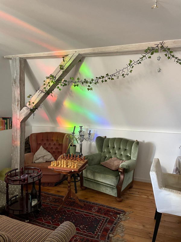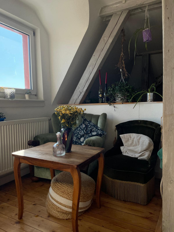 Das Zimmer ist super cozy und bietet dir einen wundervollen Blick über die Dächer von Landau. Es passt alles rein was man braucht und trotzem wäre noch platz im Flur oder im Wohnzimmer wenn du zu viele Sachen hast. Unter die Dachschräge kann man ganz wunderbar ein Bett stellen und der alte Boden bringt sehr viel Charme mit :)